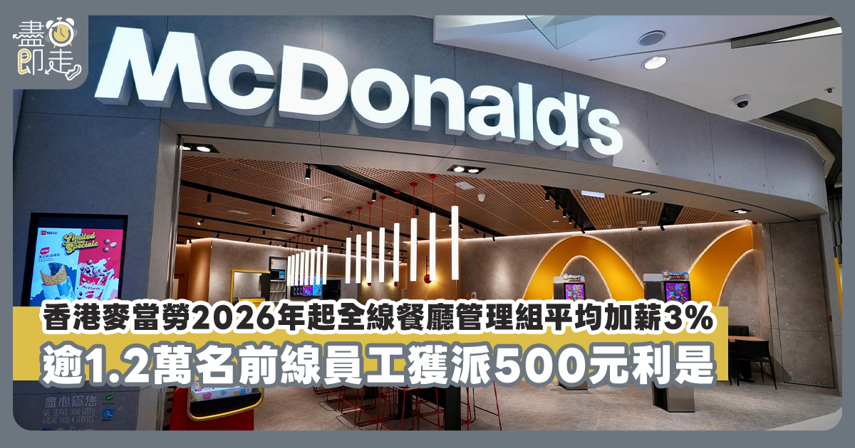 香港麥當勞宣佈,由2026年1月1日起,全線餐廳管理組獲平均加薪3%,具體加幅將視乎工作表現而定,表現卓越之員工加幅可高達5%。